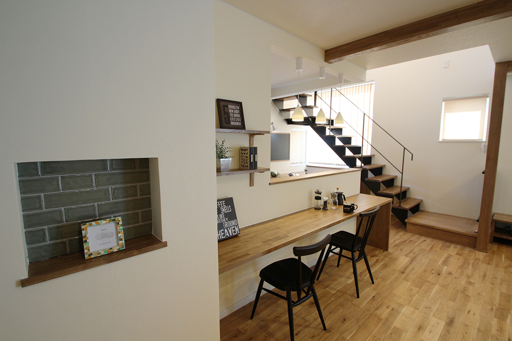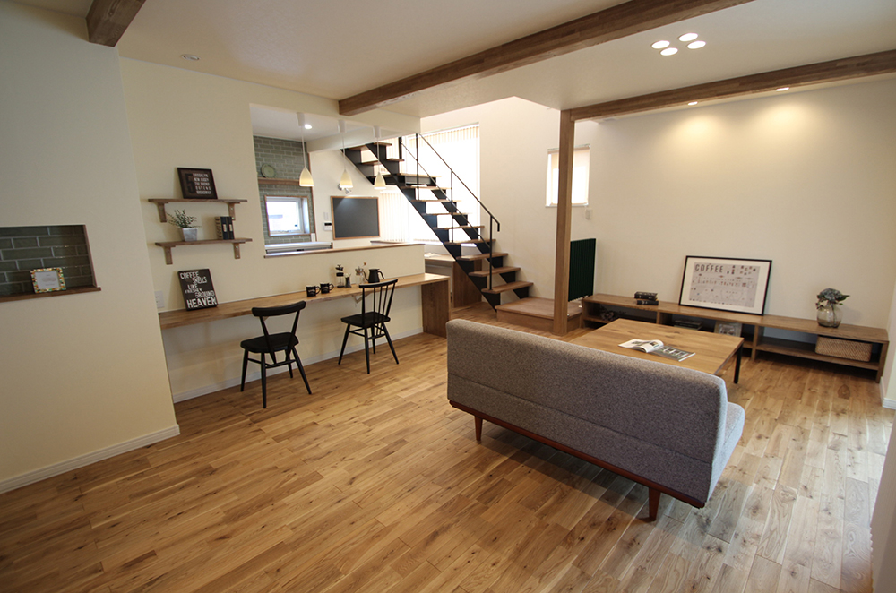 無垢フローリングや造作のカウンターテーブル・TVボード、天井の梁などの木をこげ茶で統一し、深いグリーンのタイルをキッチン背面やニッチに使いアクセントに。キッチン前カウンターで食事をされるKさまご家族、なので、ダイニングテーブルはありません。