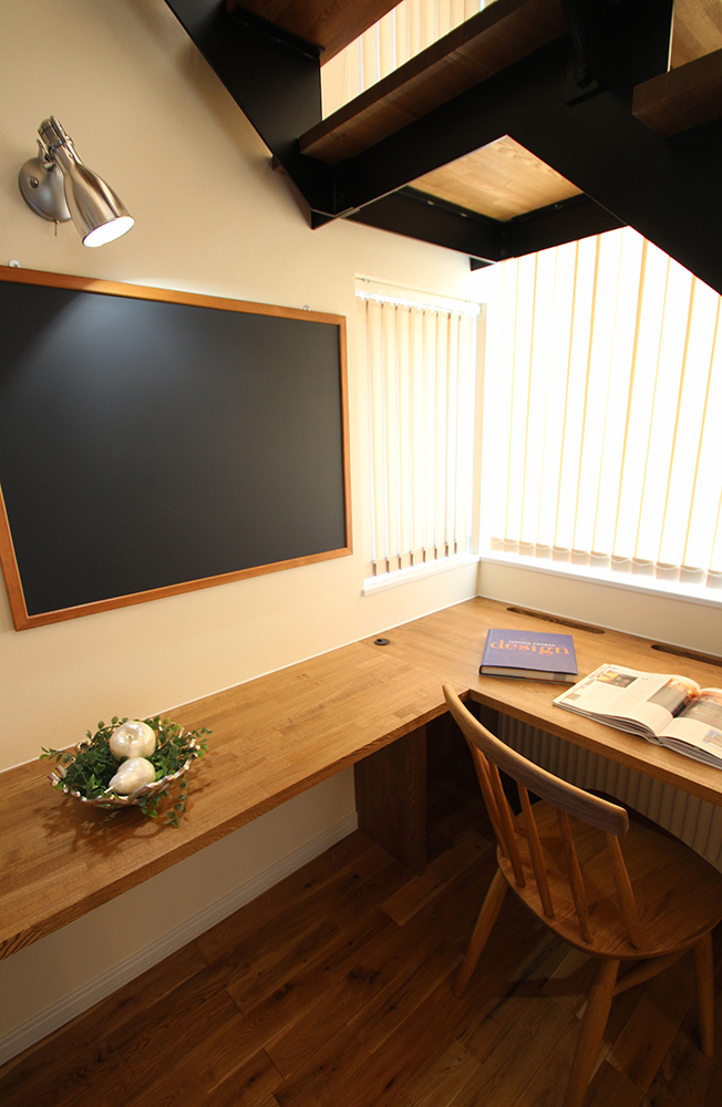 吹き抜けの穏やかな明かりを受ける階段下の書斎スペース