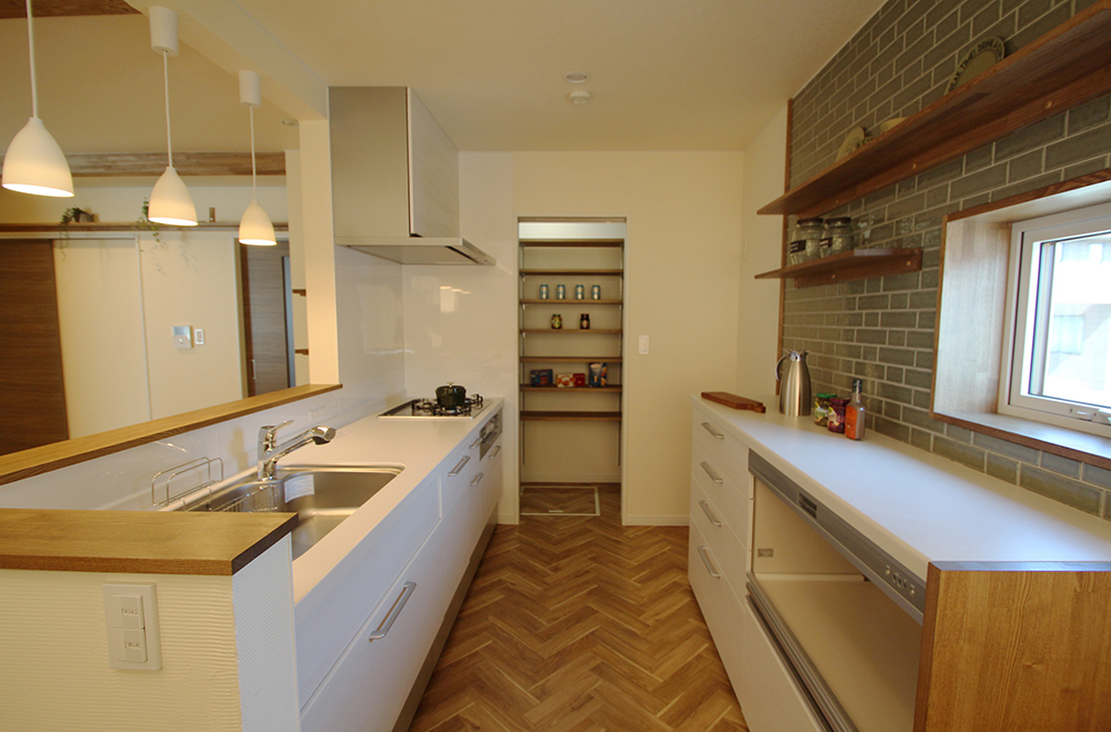 キッチンの横には1.5畳のパントリーがあり、食品など、大容量に収納できます。