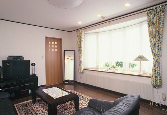 また、角地だったので往来の目線が気になっていたリビングは窓を高い位置の出窓にすることで解決。オーディオ類の配線もすべて壁の中に入れたので、空間がすっきりとしています。