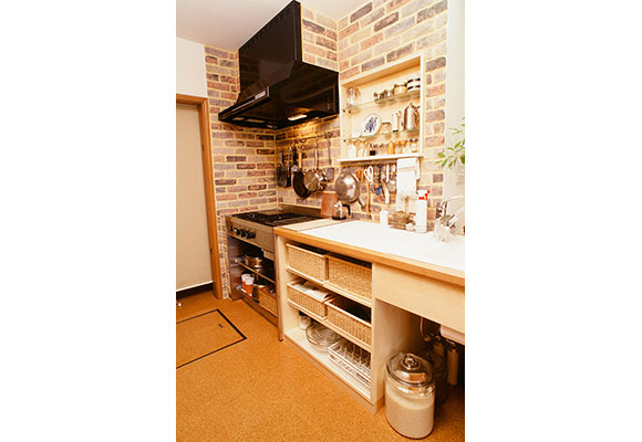 「ここでお料理ができるの!」と、奥さまが思わず感激したという、レンガと木を組み合わせたキッチンは、オープンな造りでリビングとのつながりを自然なものにしています。ダイニングテーブルは、奥さまの好きなパイン材でキッチンをL字で囲むように特注したもの。出来たての料理をカウンターに並べ、ご友人が「レストランのよう」と絶賛する自慢のスペースです。