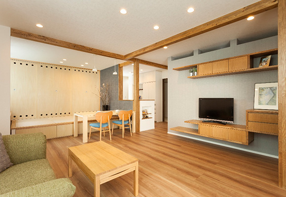長期優良住宅の基準を満たすリフォームは、補助金が受けられるのもメリットです。K様がお悩みだったのは、お子さまの成長に伴って物をしまう場所が足りなくなってきたこと。そこで収納スペースの増築を行ったほか、生活に合わせてさまざまな所に収納を設けました。和室はリビング続きの小上がりスペースに変更。下部は収納スペースとして利用、一見分からないような、たっぷり入る壁面収納もあります。さらに、家族皆さまの持ち物が置けるウォークインクローゼットも設けました。